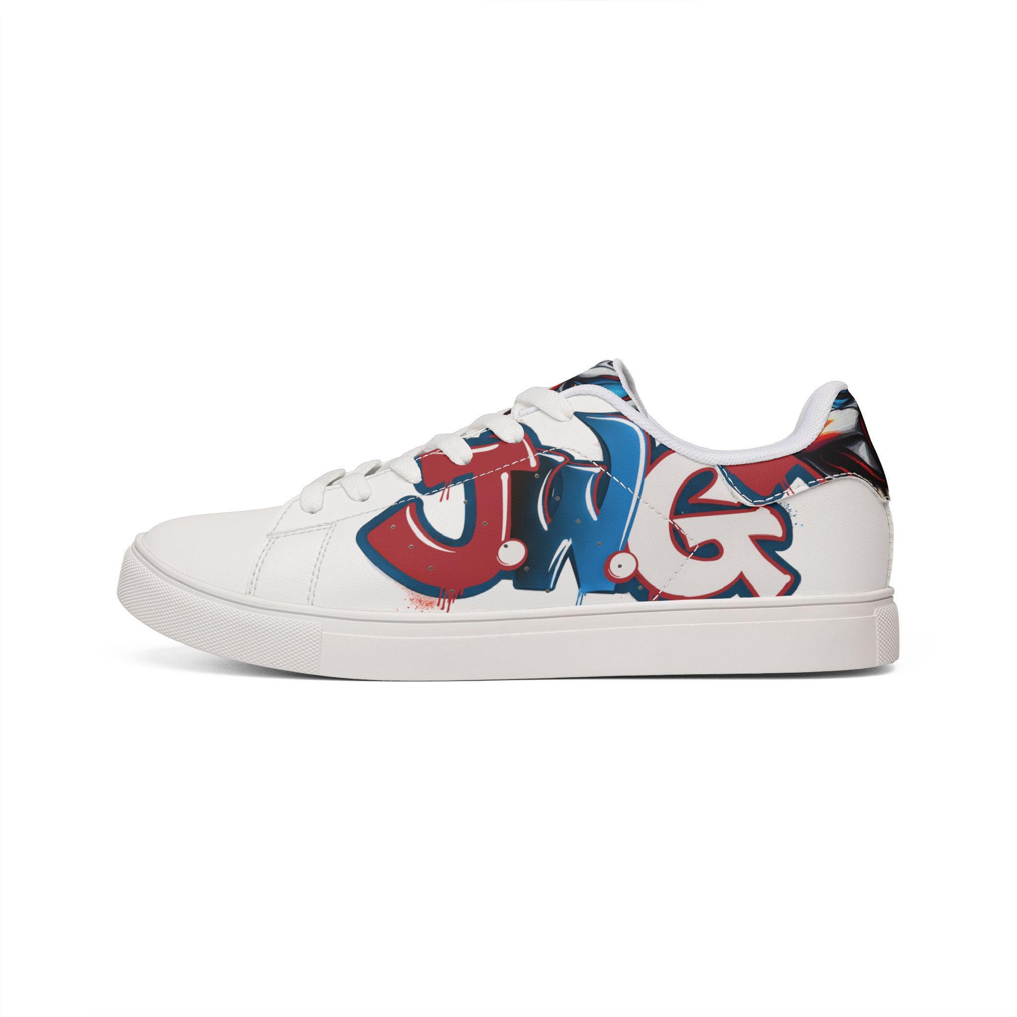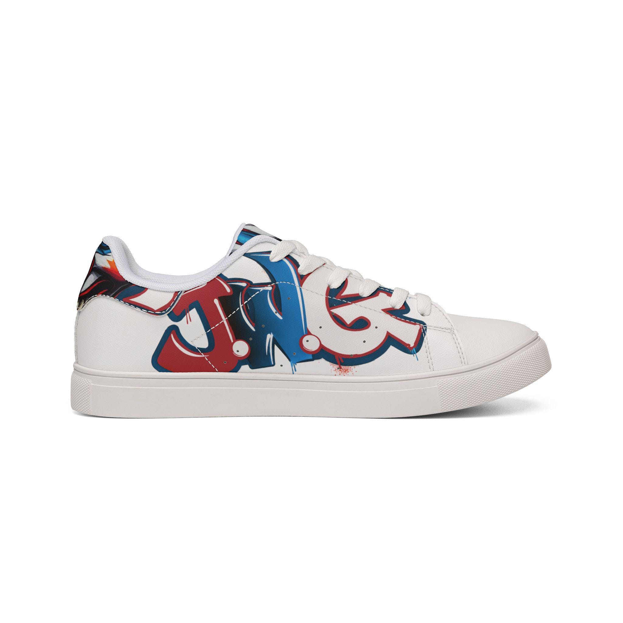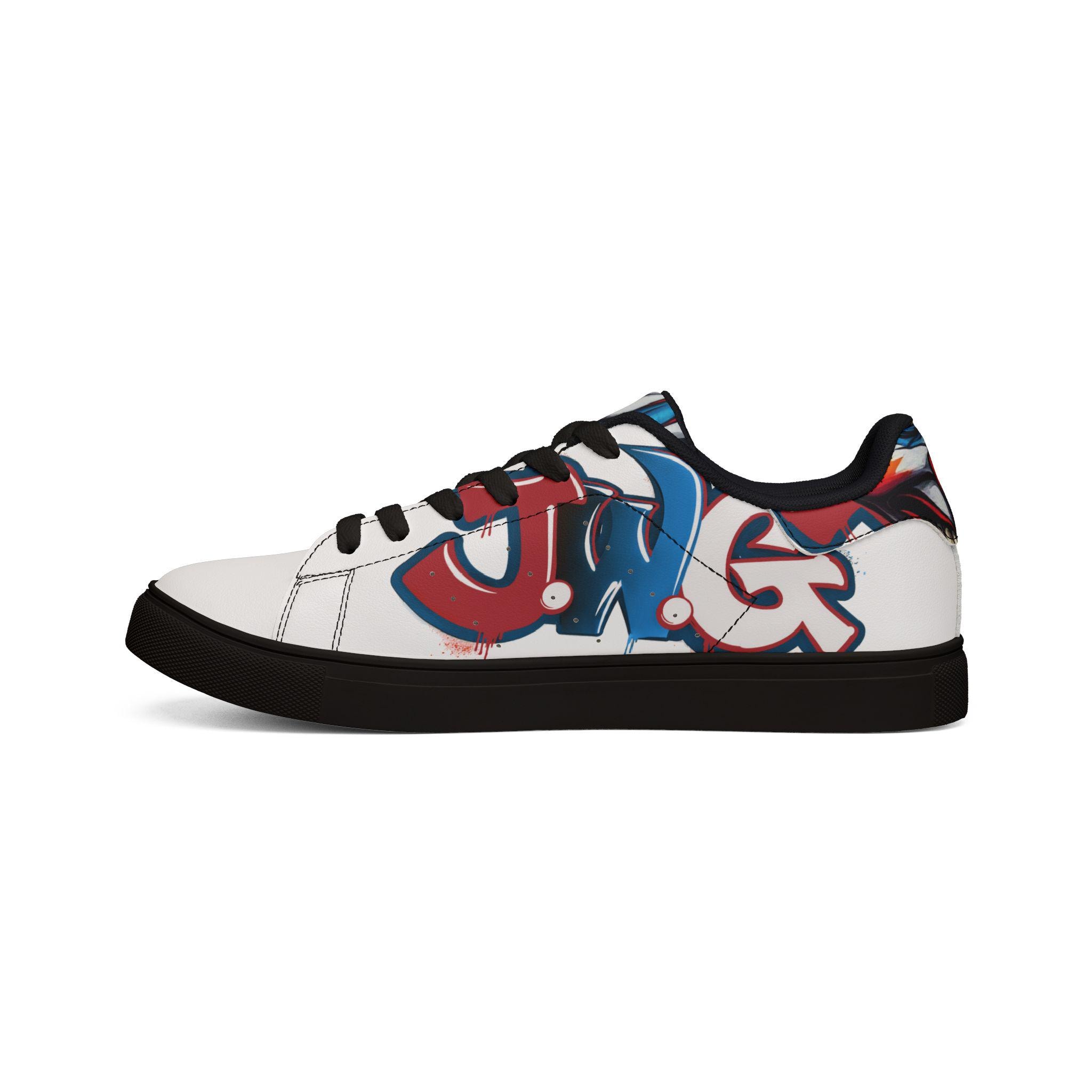 These low-top leather sneakers blend everyday comfort with bold street energy. The smooth microfiber leather upper wears like classic leather while staying lightweight and easy to care for. A cushioned EVA layer under a durable rubber outsole keeps each step springy and stable, and the lace-up closure locks the foot in for confident movement. The sneakers' white base lets graffiti-inspired red and blue artwork pop across the sides, adding an urban, expressive note to jeans, skirts, or weekend layers. They feel lived-in from the first walk — casual, confident, and ready to carry you through markets, late coffee runs, and neighborhood art hunts.
