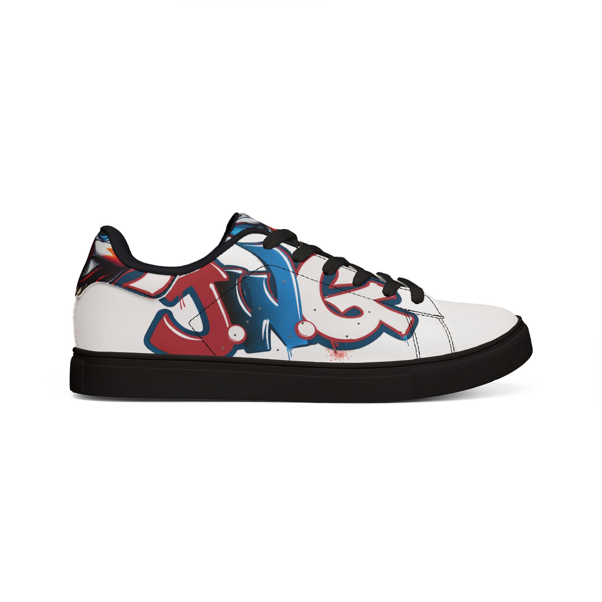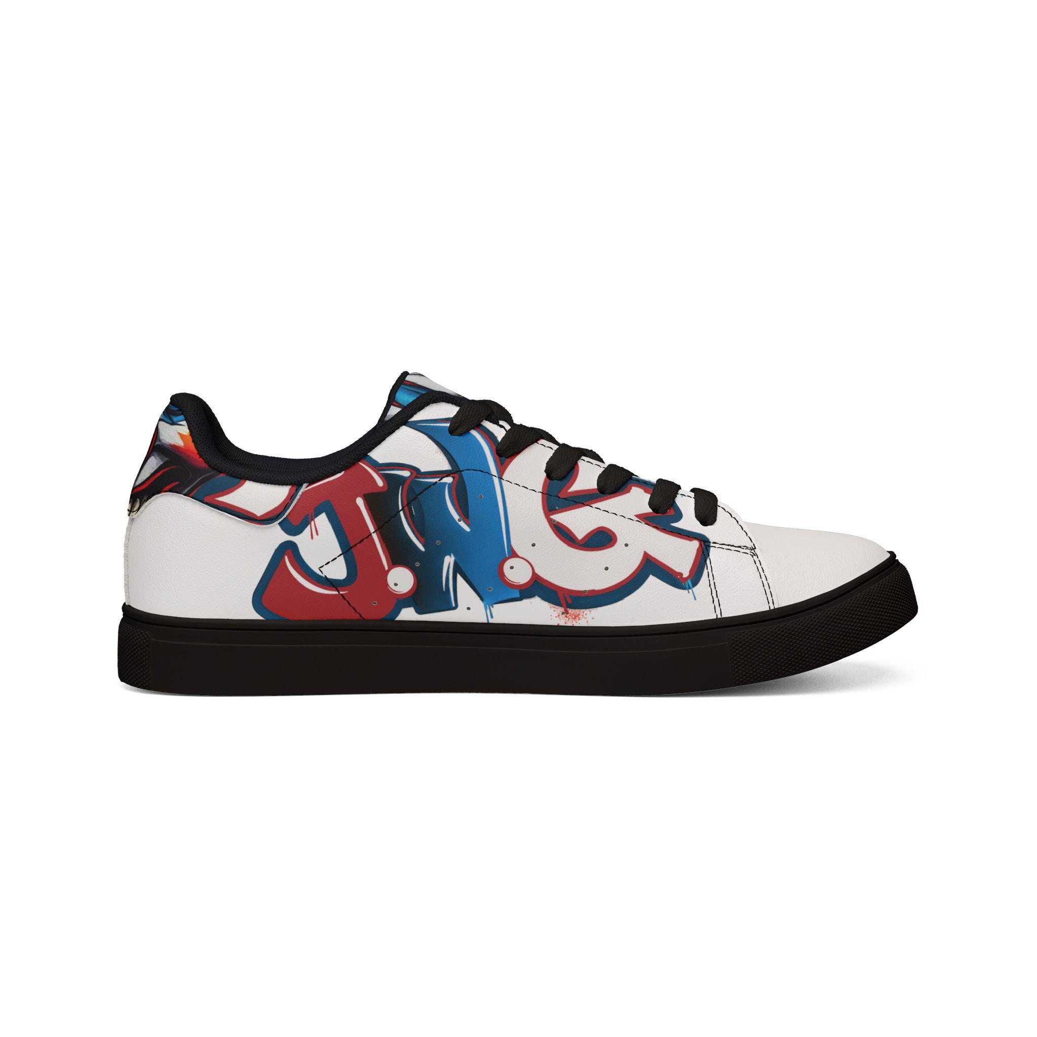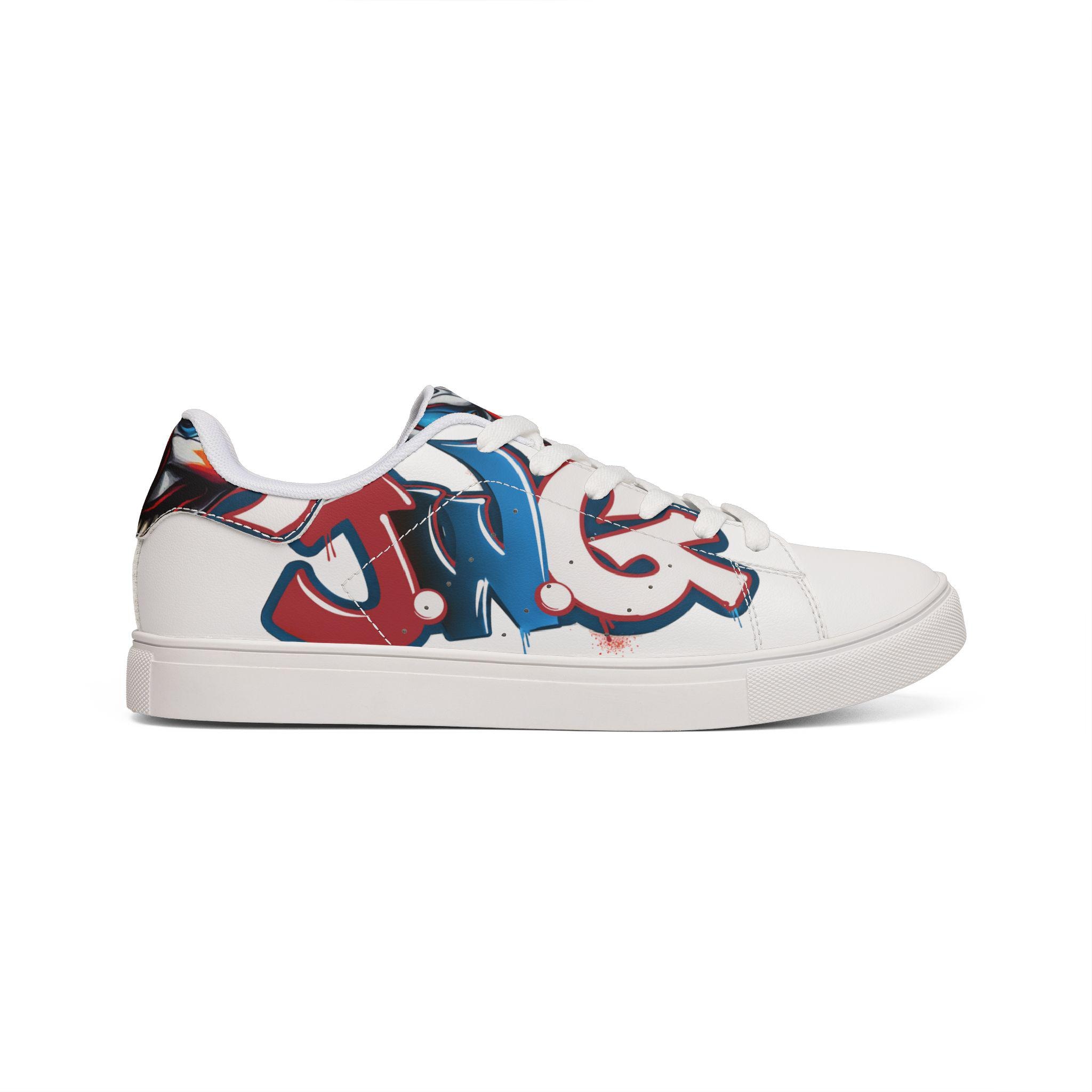 These low-top leather sneakers blend everyday comfort with bold street energy. The smooth microfiber leather upper wears like classic leather while staying lightweight and easy to care for. A cushioned EVA layer under a durable rubber outsole keeps each step springy and stable, and the lace-up closure locks the foot in for confident movement. The sneakers' white base lets graffiti-inspired red and blue artwork pop across the sides, adding an urban, expressive note to jeans, skirts, or weekend layers. They feel lived-in from the first walk — casual, confident, and ready to carry you through markets, late coffee runs, and neighborhood art hunts.
