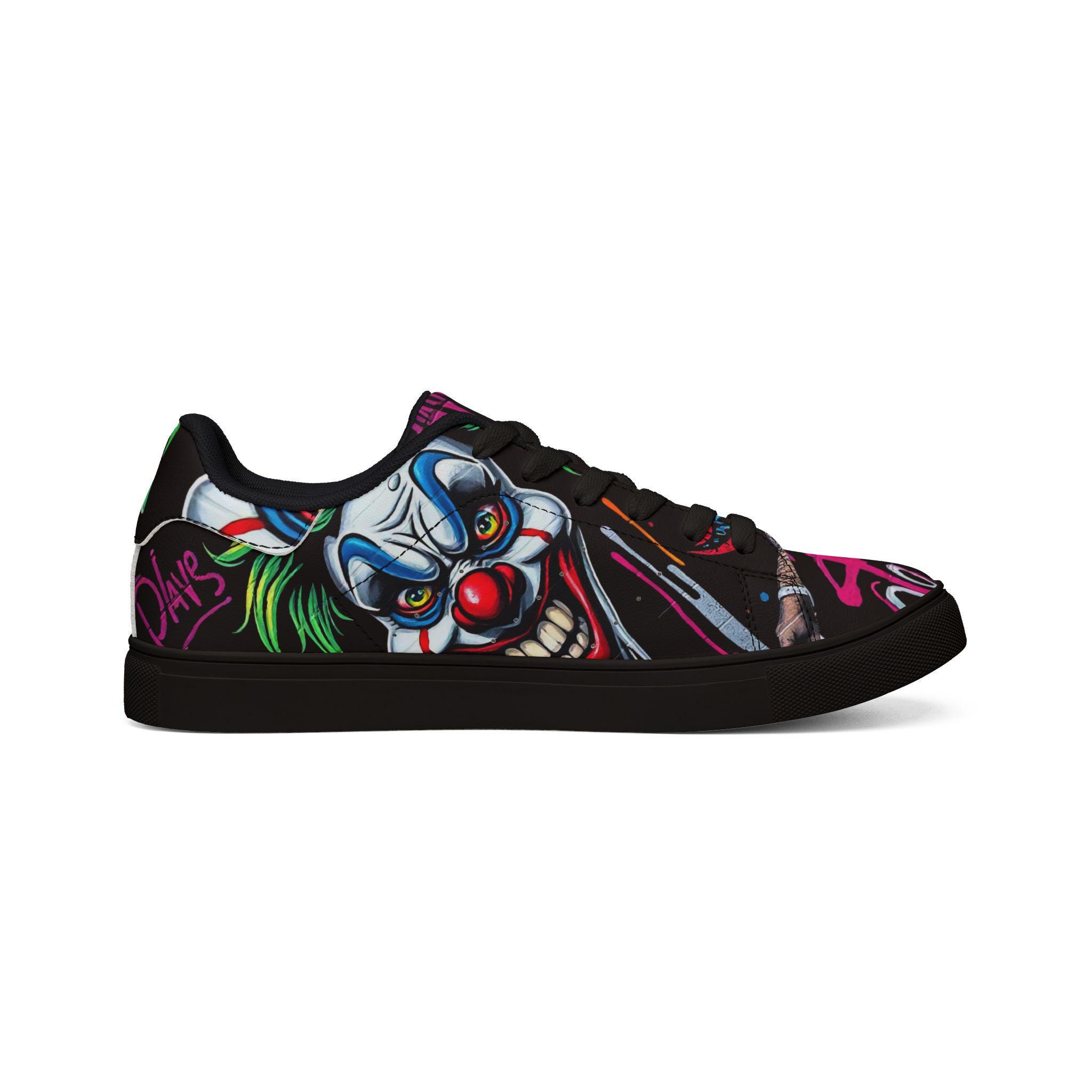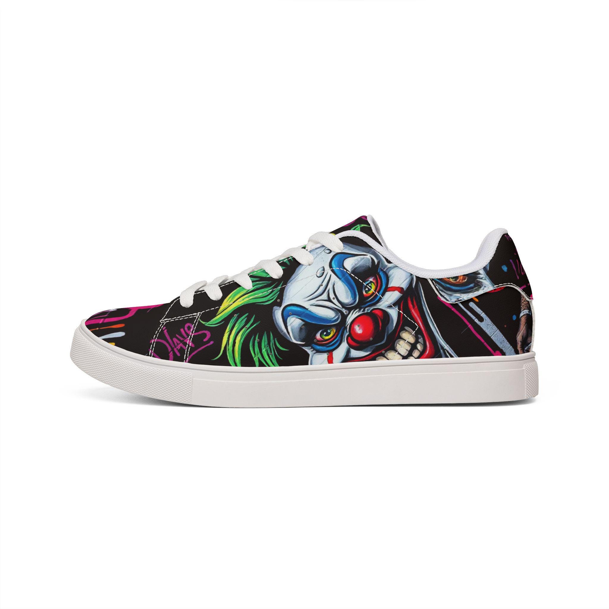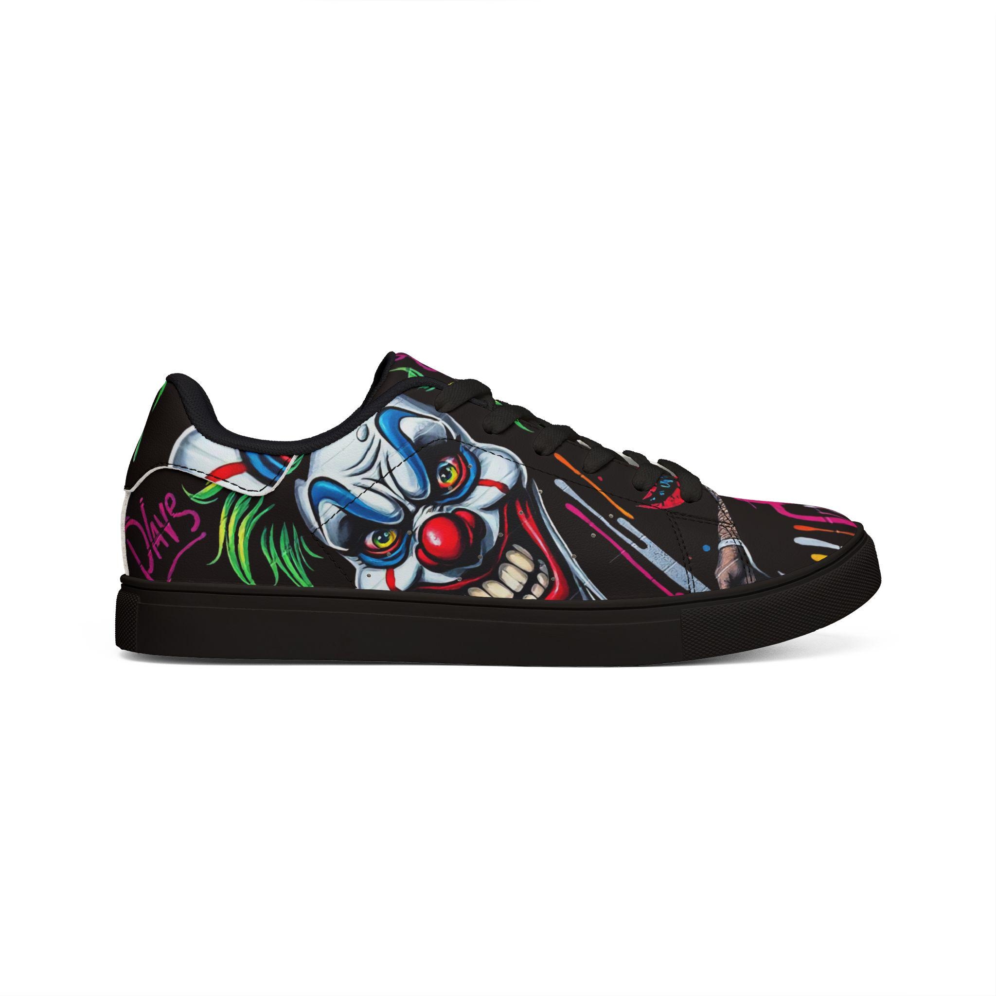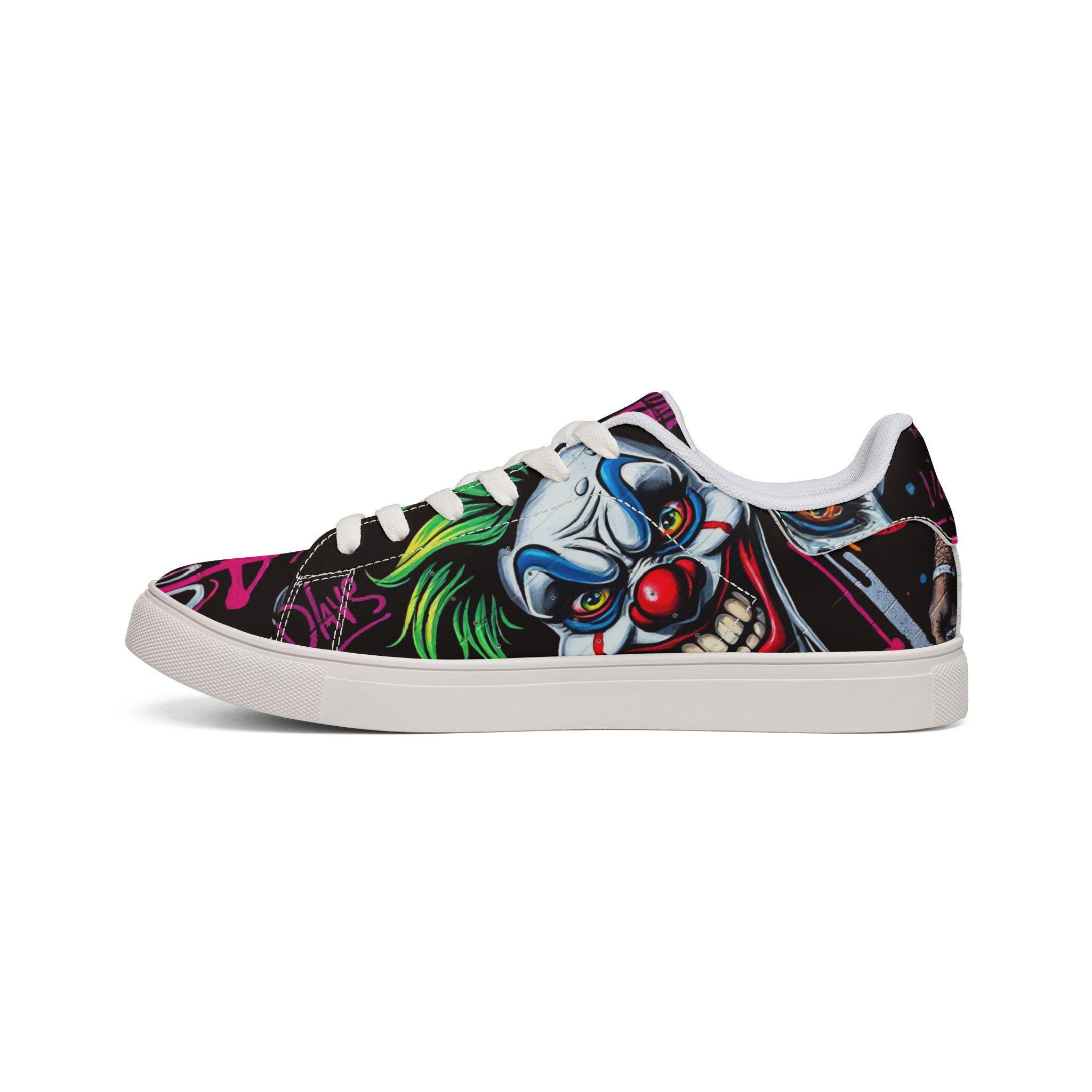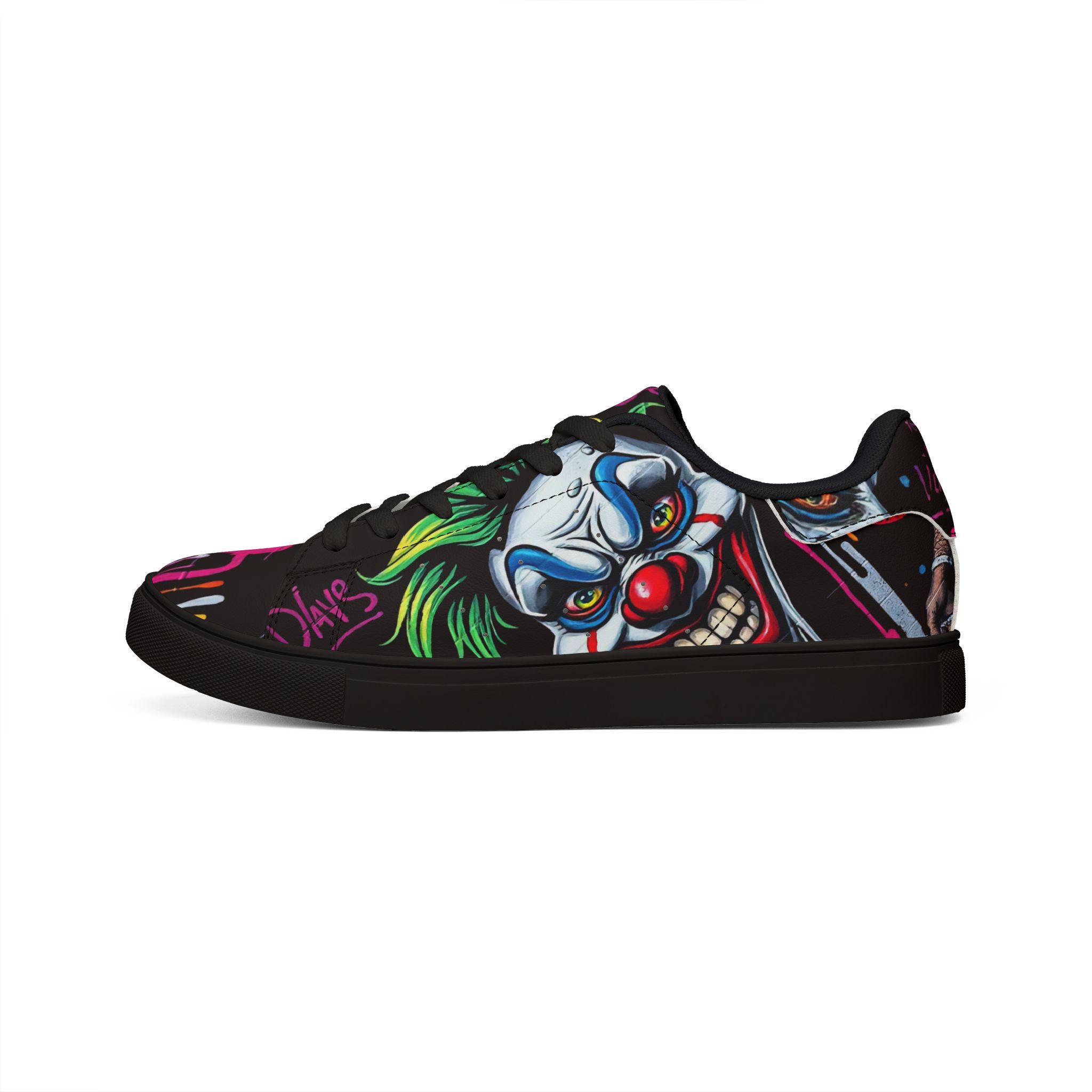 These low-top leather sneakers bring street energy to every step. The bold, graffiti-style clown artwork wraps the upper in neon pinks, greens, and electric blues against a deep black background, making each stride feel like part of a midnight urban canvas. Lightweight microfiber leather keeps the silhouette sleek while giving the look and feel of genuine leather. A cushioned EVA midlayer and grippy rubber outsole absorb impact and hold steady from pavement to skatepark. Lace-up closure locks the foot in place for confident movement. Wear them to late-night shows, art runs, or any day you want footwear that speaks louder than words.