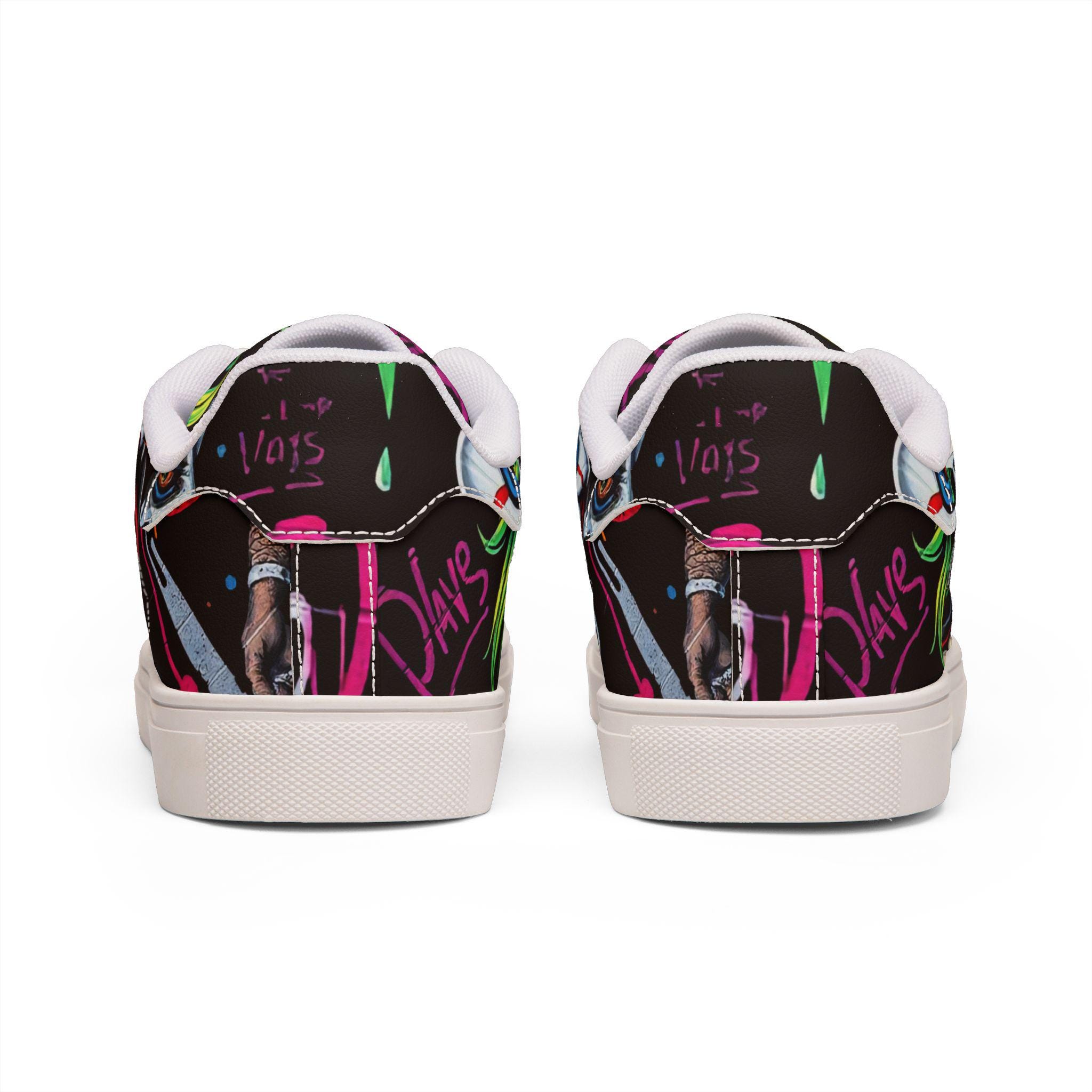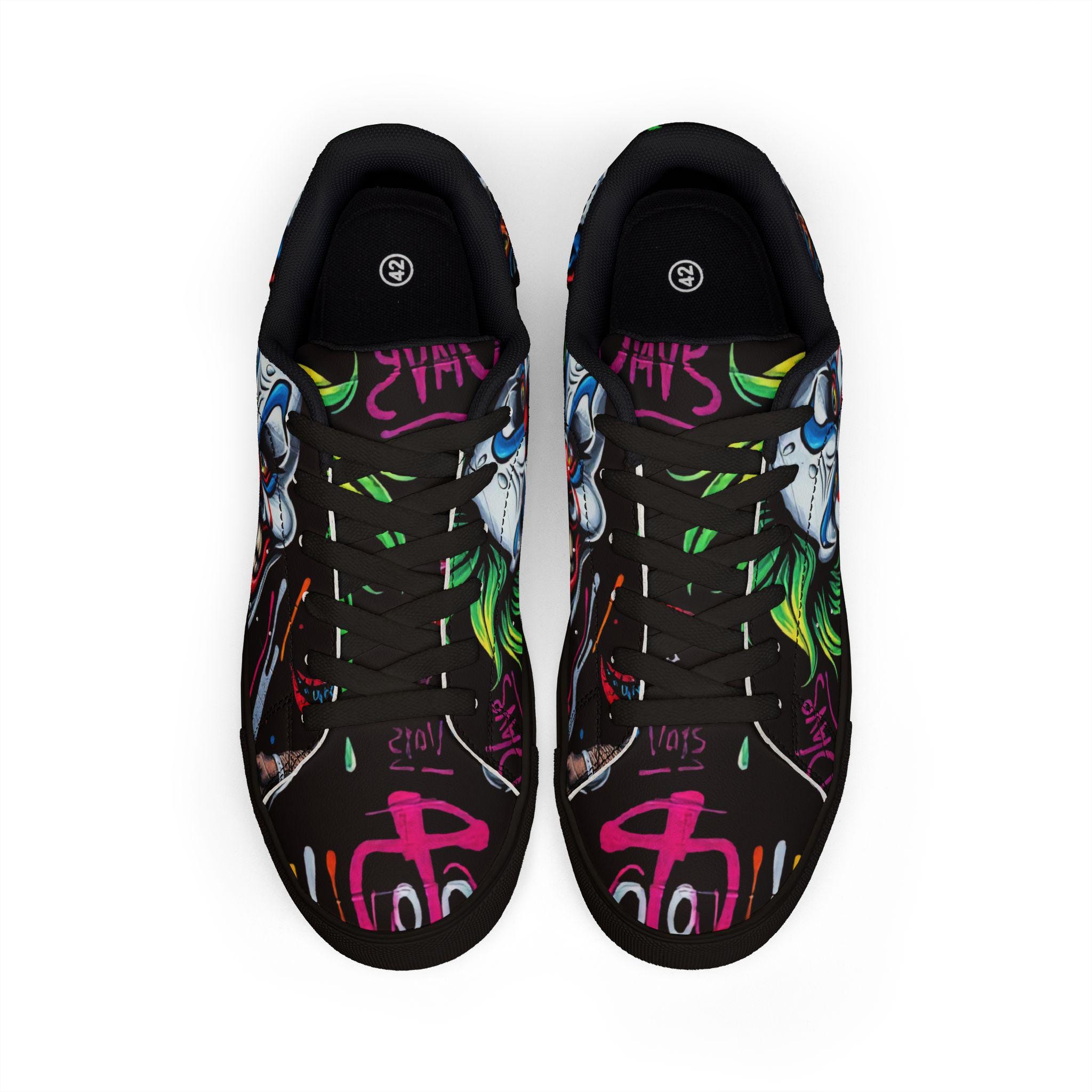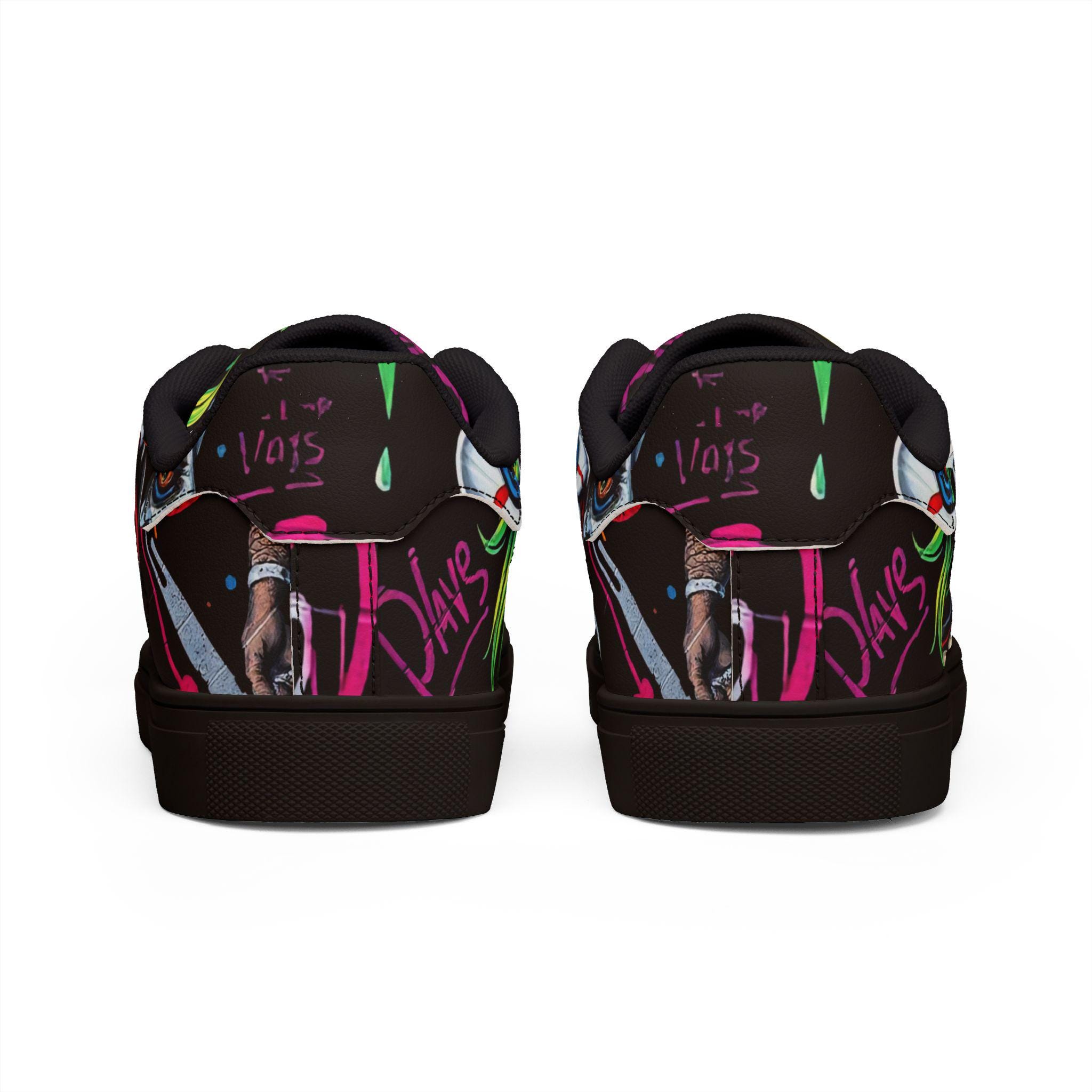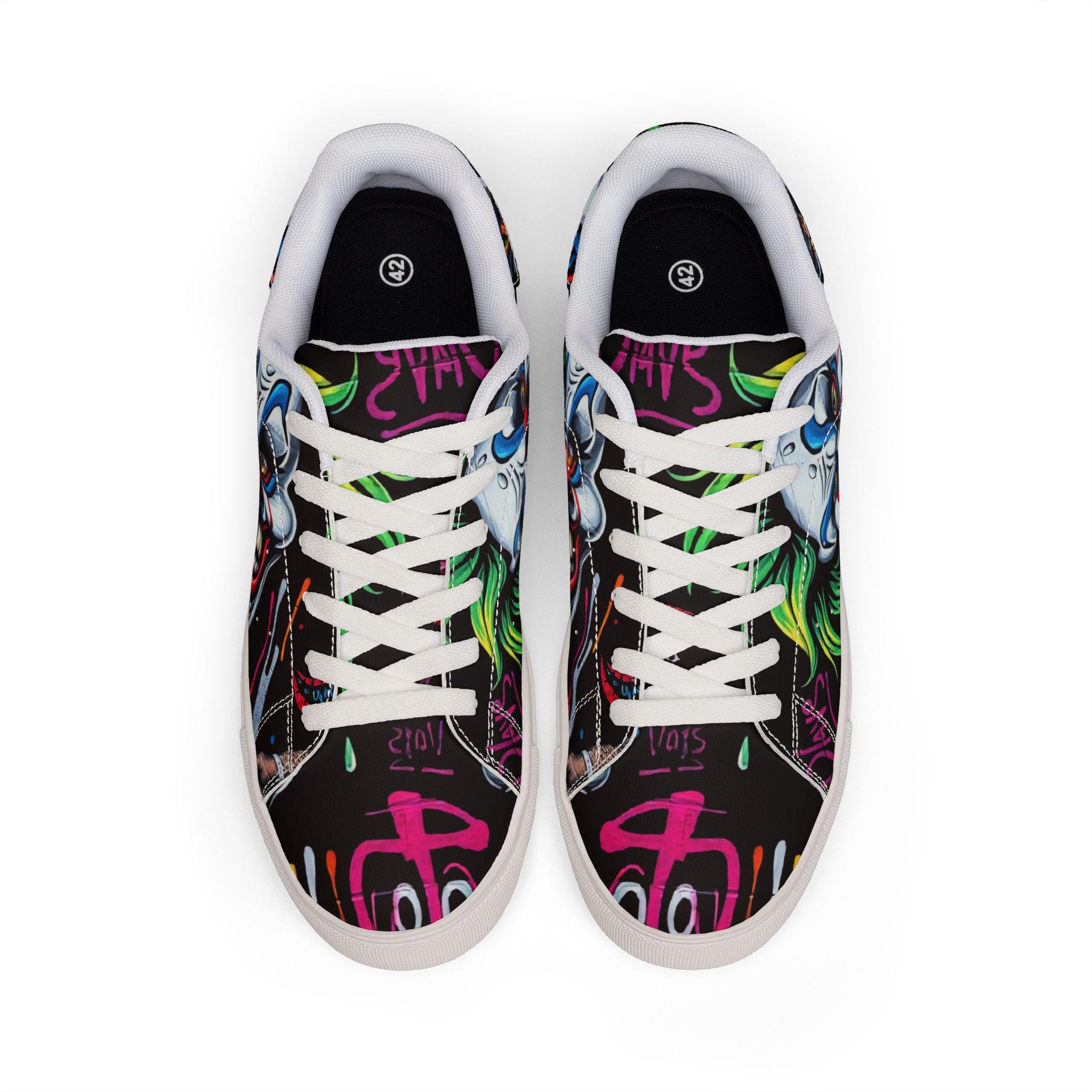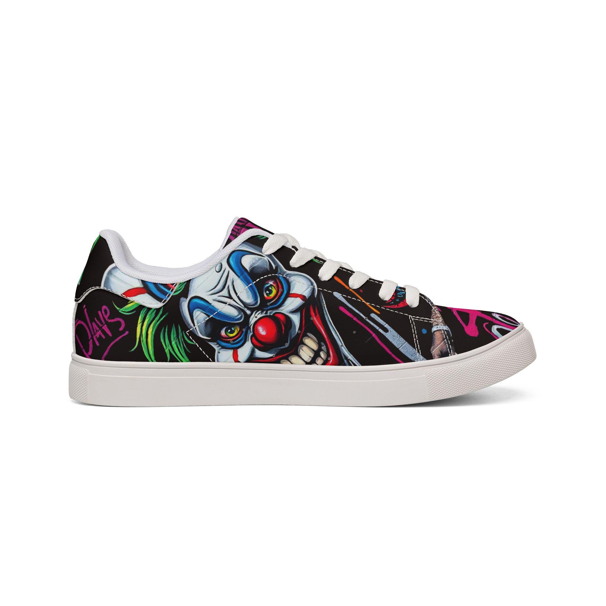 These low-top leather sneakers bring street energy to every step. The bold, graffiti-style clown artwork wraps the upper in neon pinks, greens, and electric blues against a deep black background, making each stride feel like part of a midnight urban canvas. Lightweight microfiber leather keeps the silhouette sleek while giving the look and feel of genuine leather. A cushioned EVA midlayer and grippy rubber outsole absorb impact and hold steady from pavement to skatepark. Lace-up closure locks the foot in place for confident movement. Wear them to late-night shows, art runs, or any day you want footwear that speaks louder than words.