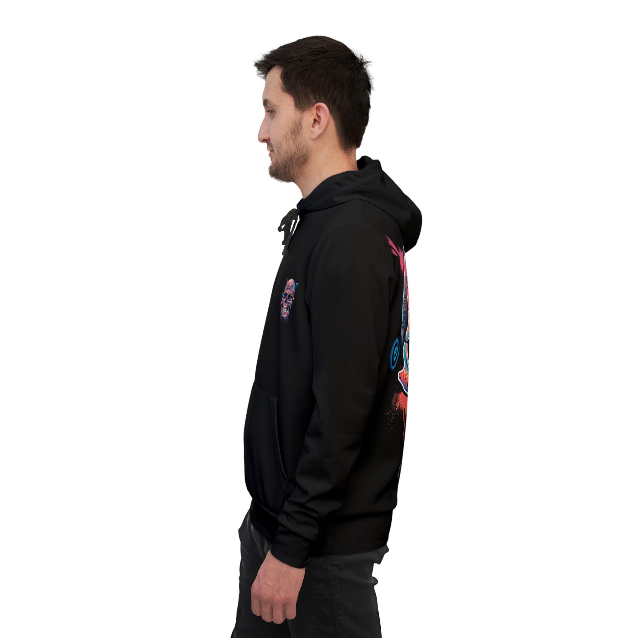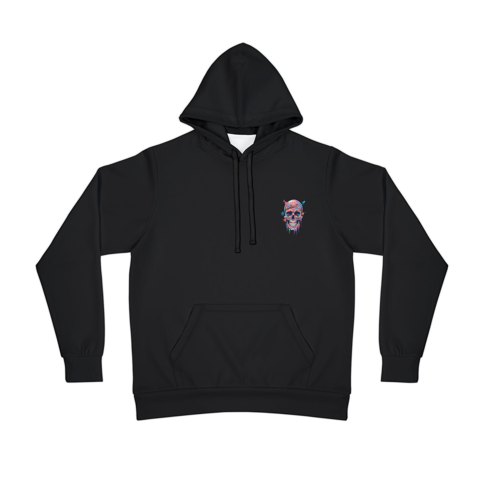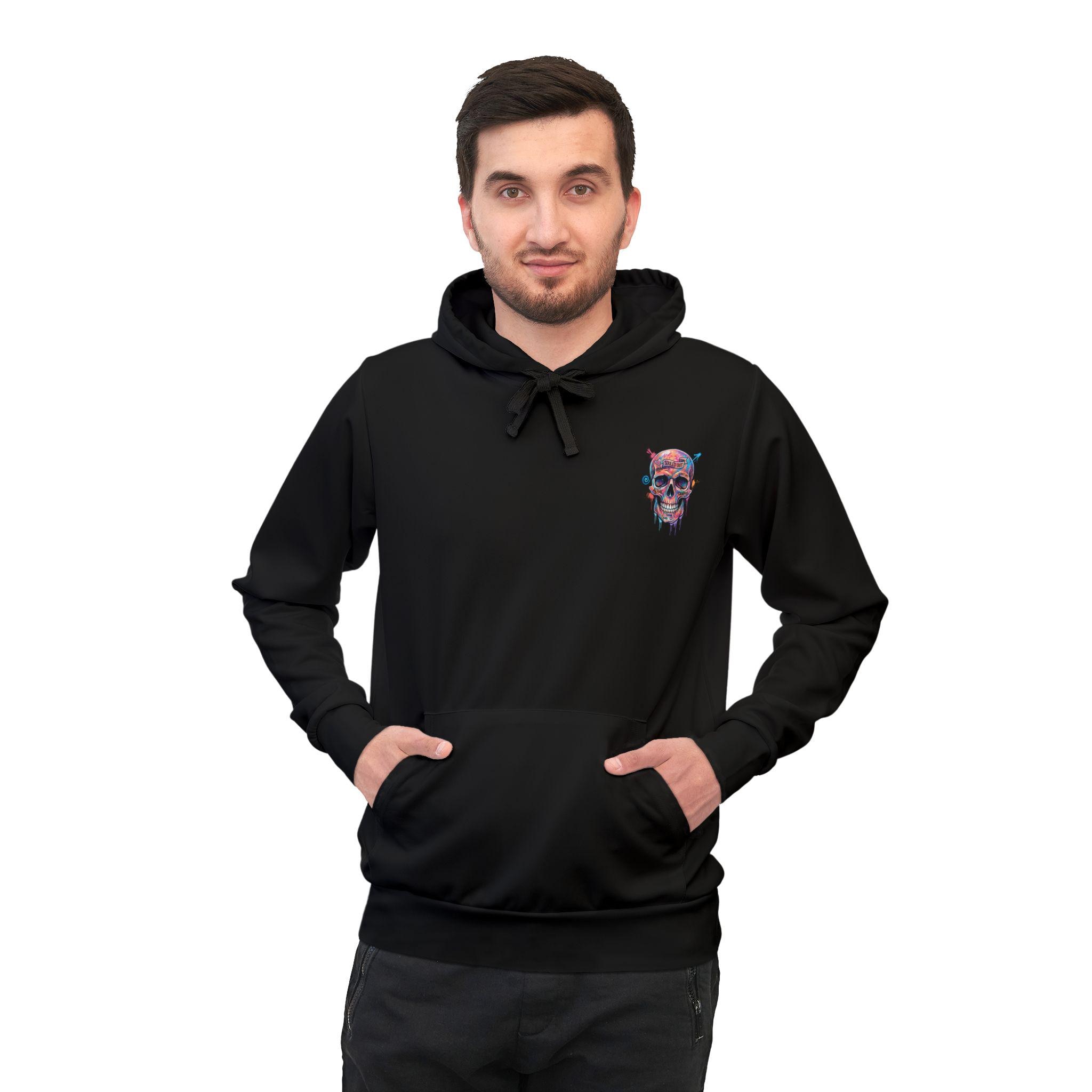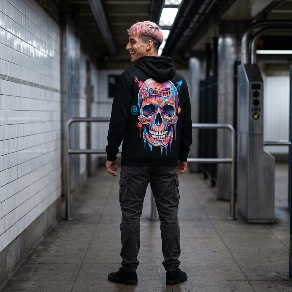 This blackout hoodie carries a bold, street-art energy—soft against the skin but loud in presence. A luminous, paint-drip skull sits on the back, flashing neon pinks, blues and oranges that feel like a midnight mural under city lights. The small chest skull keeps the look balanced when you want low-key edge. Wear it on late-night skate runs, to underground shows, or when you need an evening layer for city walks. The recycled polyester knit moves with you and holds the vibrant print, so the colors keep popping through seasons.