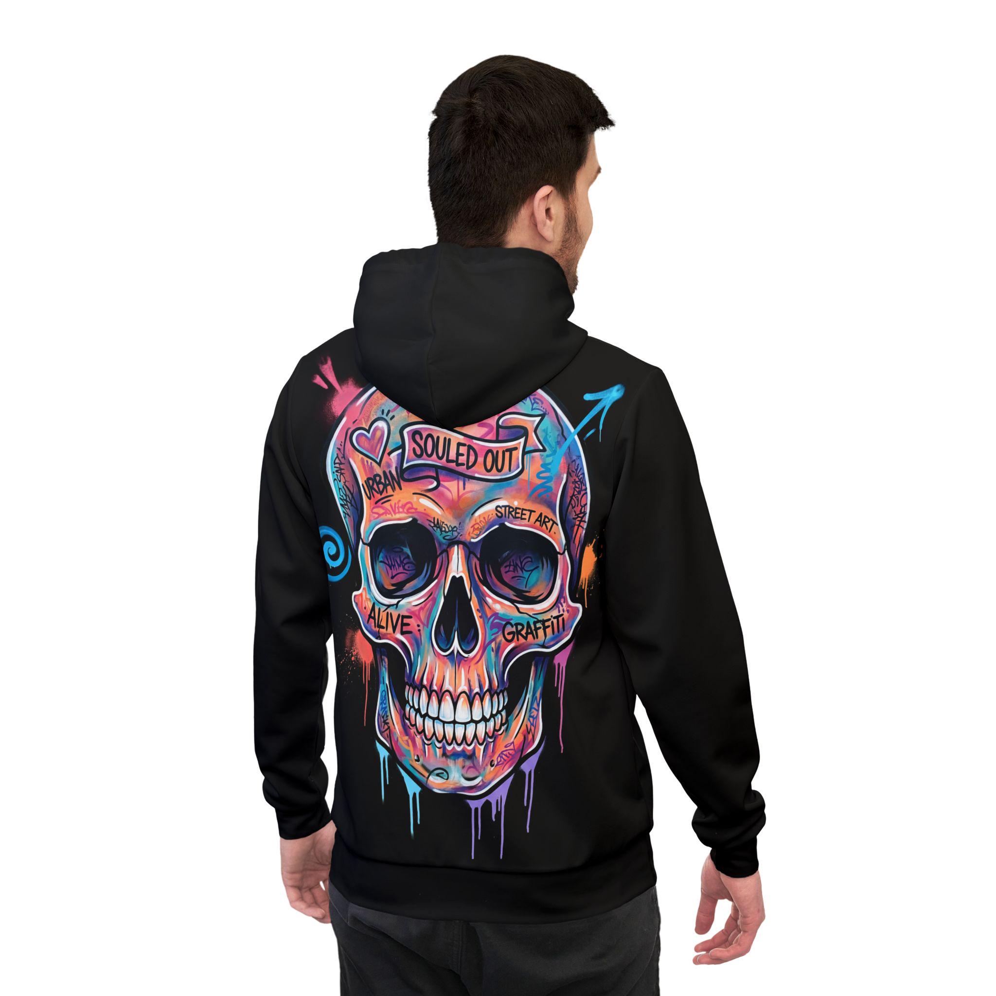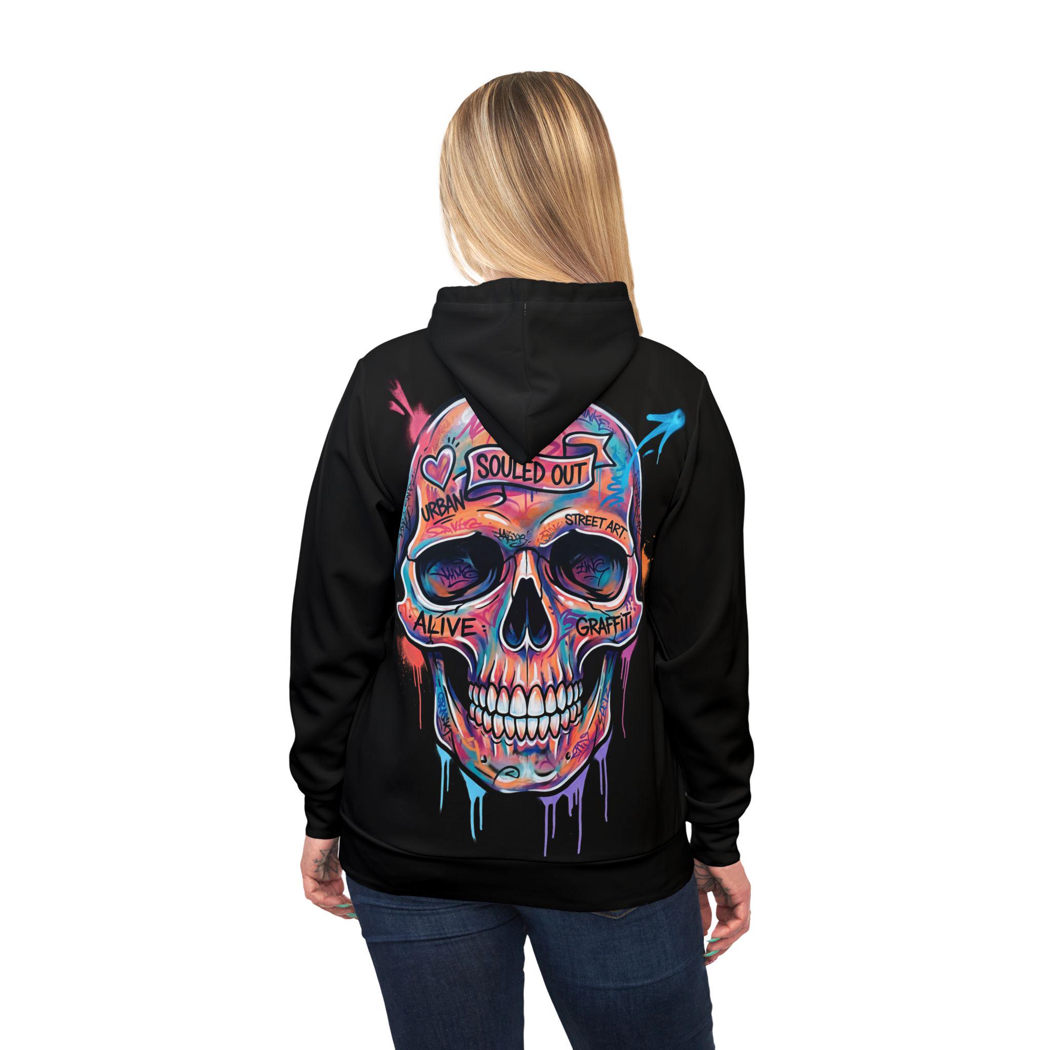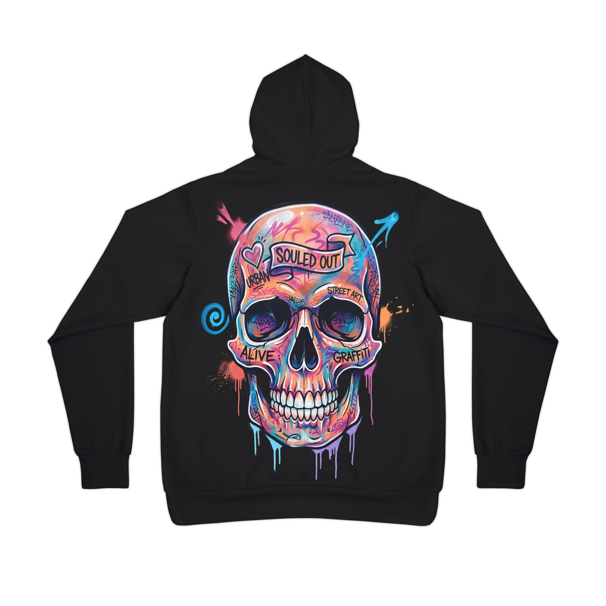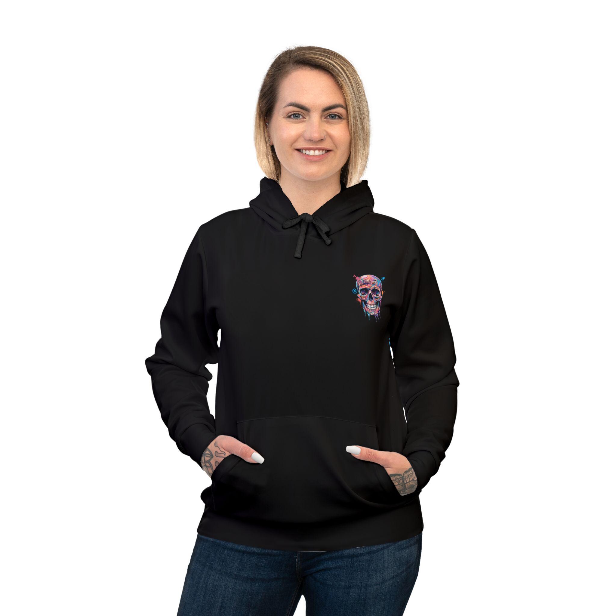 This blackout hoodie carries a bold, street-art energy—soft against the skin but loud in presence. A luminous, paint-drip skull sits on the back, flashing neon pinks, blues and oranges that feel like a midnight mural under city lights. The small chest skull keeps the look balanced when you want low-key edge. Wear it on late-night skate runs, to underground shows, or when you need an evening layer for city walks. The recycled polyester knit moves with you and holds the vibrant print, so the colors keep popping through seasons.